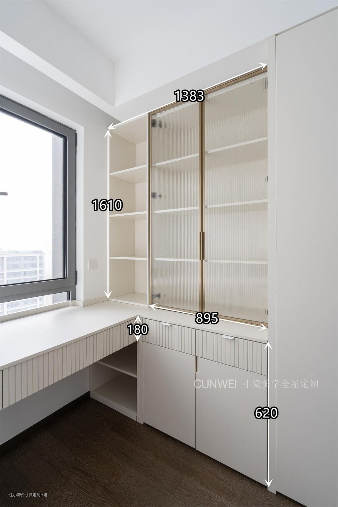 手边设计了长1383mm,高1610mm的局部书柜,收纳各种书本,学习时随手拿取更加方便,长虹玻璃元素的加入让空间更显清透,丰富了空间层次感,关键是还减少了书本落灰的情况。