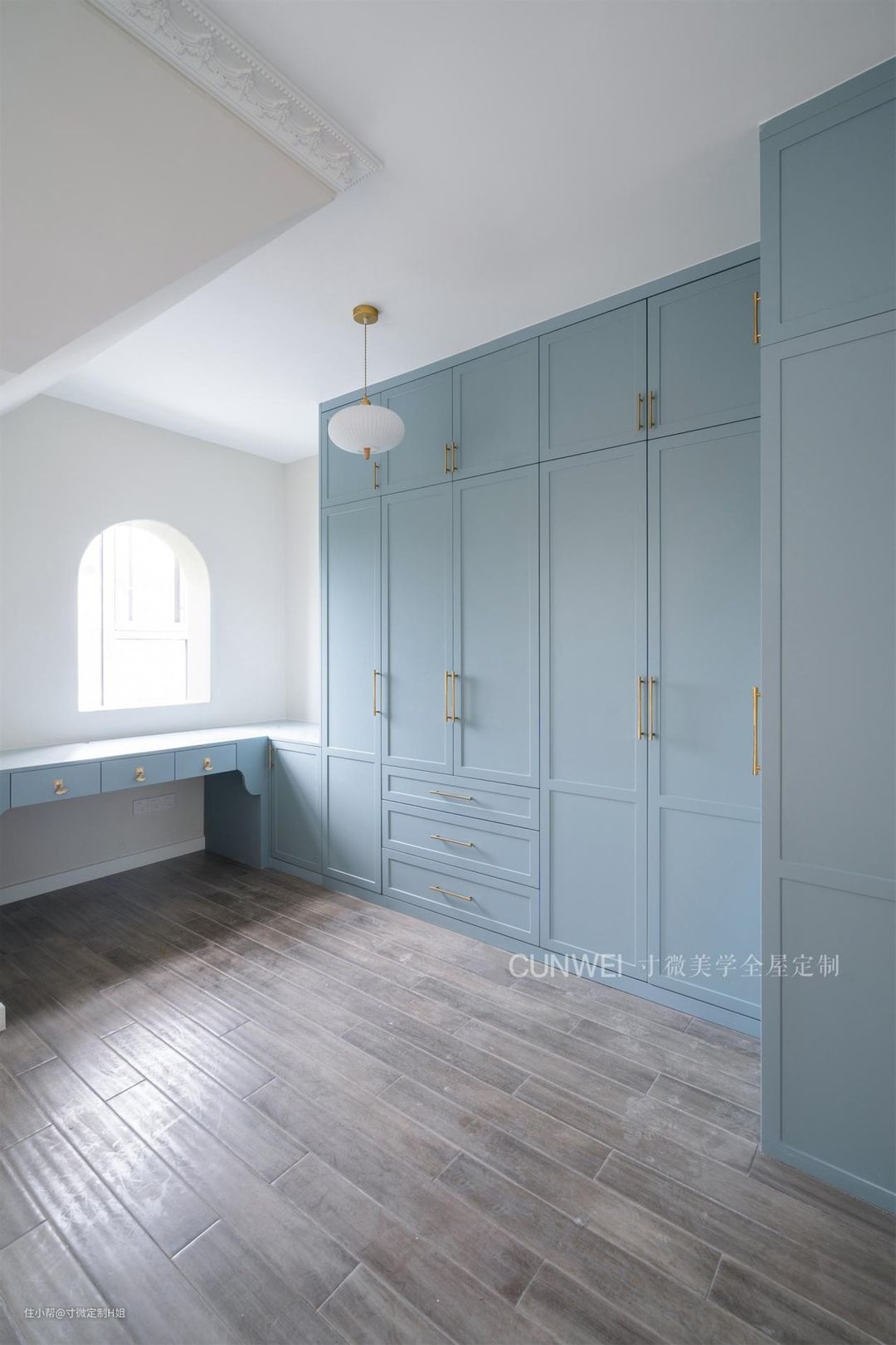 喜欢更加复古的氛围,也可以参考我们家这位阜阳西苑小区名门苑的衣帽间设计,选择的是世纪薄荷混油色,淡淡的蓝色搭配金色拉手,这样的浪漫与优雅氛围太完美了。