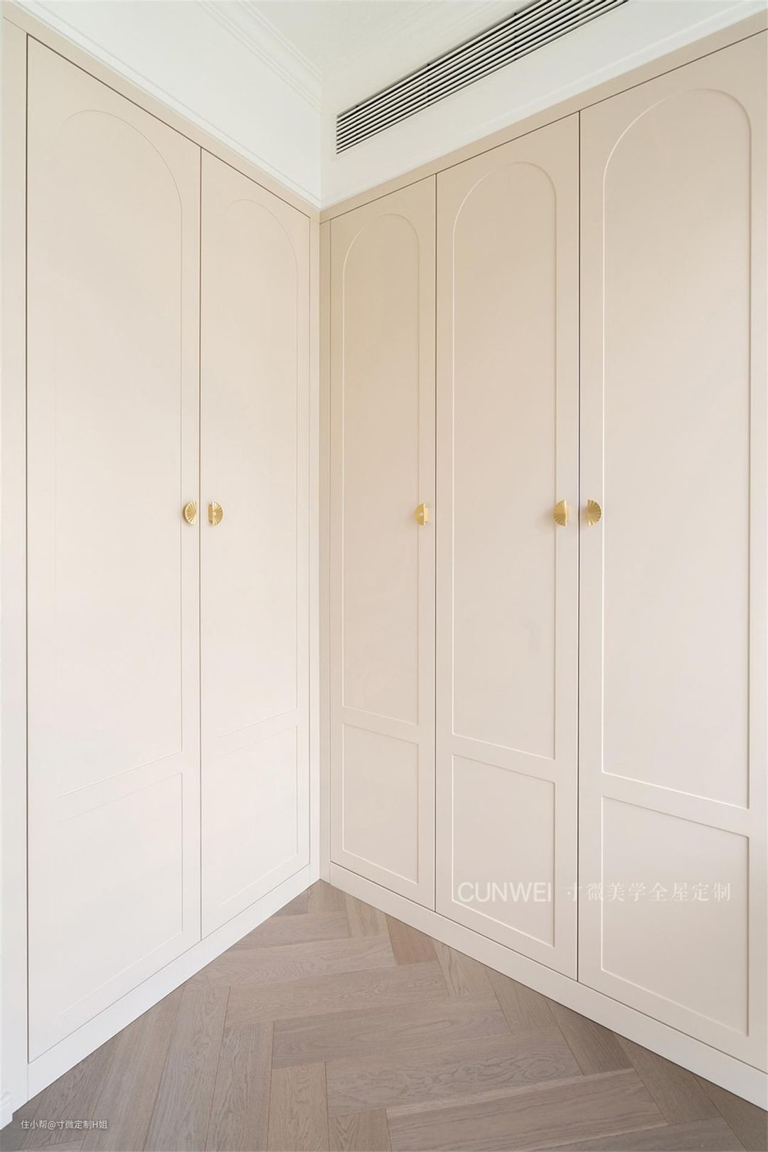 低饱和度的混油色系,搭配扇形金色拉手也是个不错的选择,一门到顶的L型衣柜完美满足屋主对于衣物的收纳需求。
