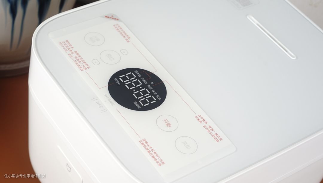 米家智能电饭煲正面只有一个开盖按钮,其上为米家的LOGO,简洁大方;在顶盖则是米家智能电饭煲4L微压版的触控区域,中间黑色的部分是一块智显的LED屏幕,字大清晰,老人小孩都能看得清楚。左右两侧各有两枚触摸按键,分别是取消、预约、开始和菜单。下方还有NFC标签区域,用手机轻轻一碰即可解锁更多美食食谱;顶部的开孔为煮饭的排气孔,使用的时候要小心水蒸汽烫伤。