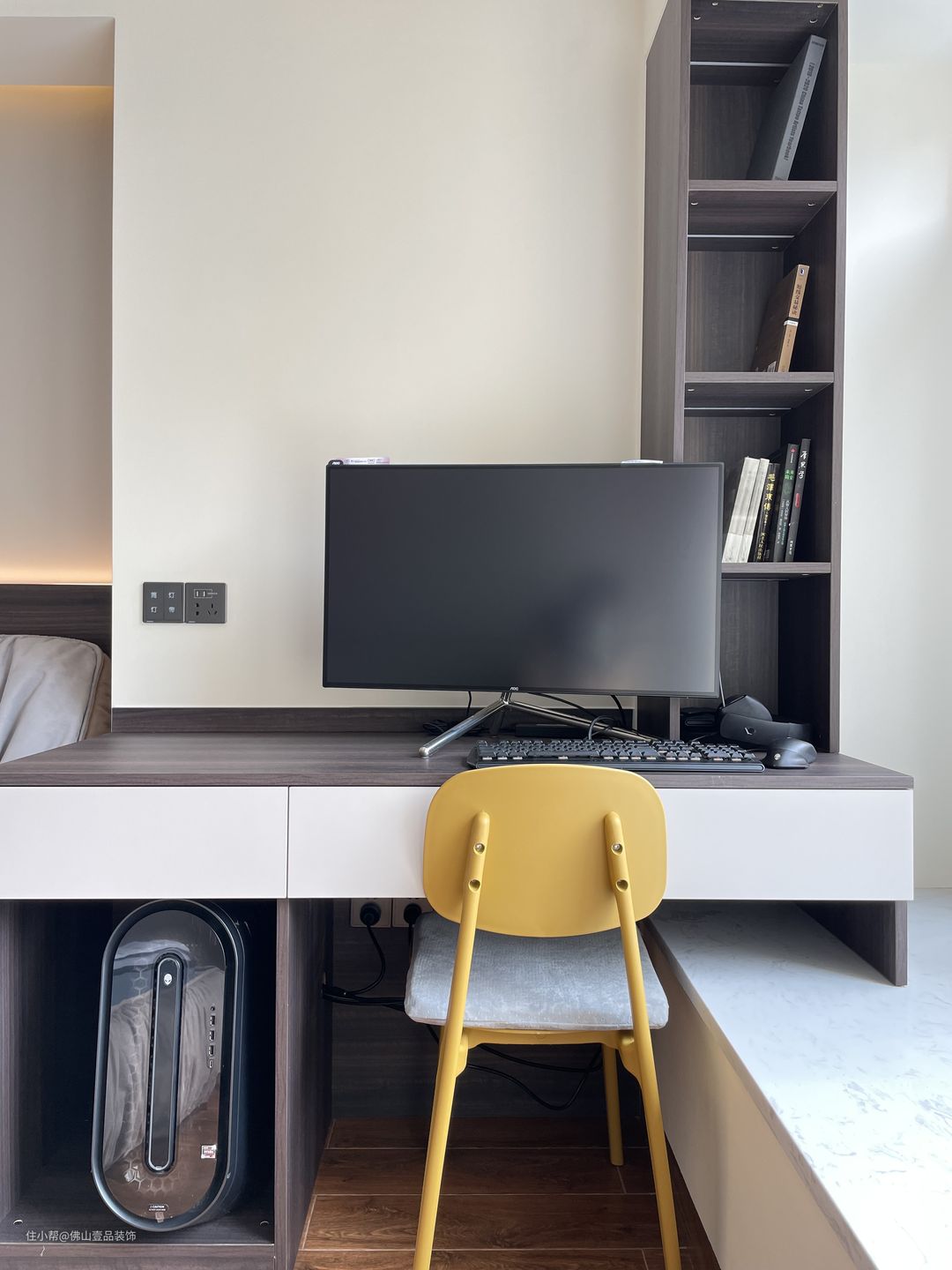 3.学习办公区:这个区域一般都是靠近窗户位置,因为采光比较好,而且整个功能区的占据面积不是很大,不会过多的影响空间的整体采光等。利用飘台延伸做了学习桌,飘台定制了一排的储物格,内置灯带,平时放置书籍以及护肤品都很实用。做了两处的插座位,平时的使用是比较方便的。