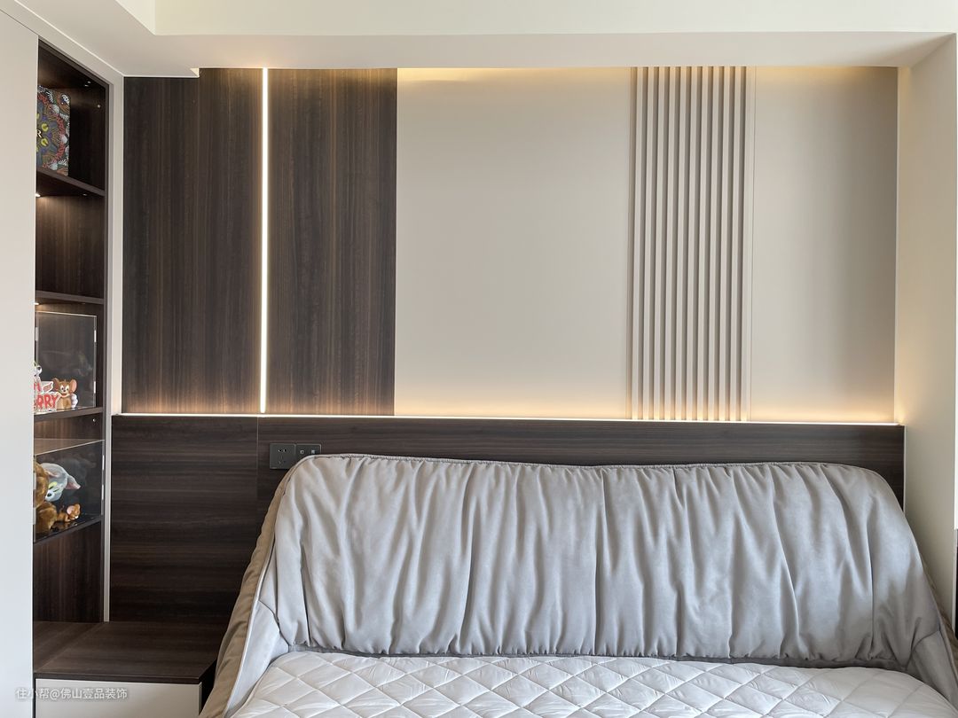 床头灯光:灰咖撞色搭配的护墙板作为背景墙,这里是做了3处的灯光设计,上方是隐藏式的小灯带,床头靠上一点同样做了一排的小灯带,兼做日常的起床的小灯,同时又不会过于耀眼,影响了休息。在上下两侧的灯带利用一节小灯带连接,仿佛将整个背景墙连成了一个整体,简单而实用。