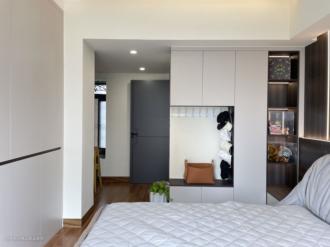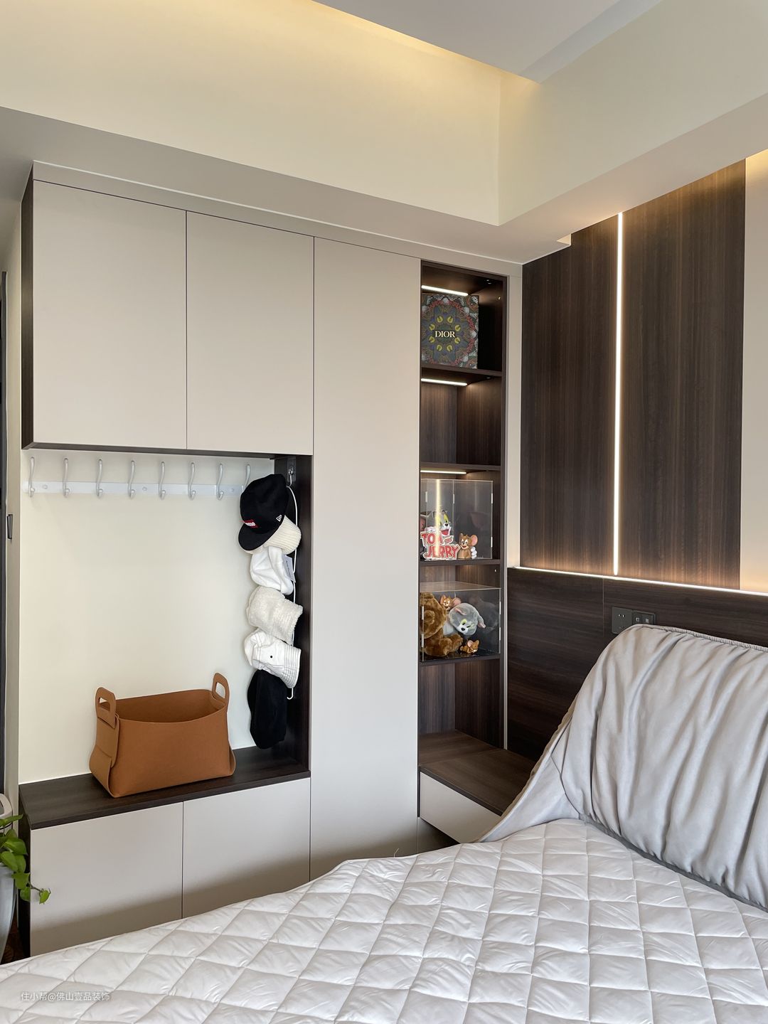 床头侧收纳:收纳柜与床头柜采用了一体的设计,利用衣柜的延伸做了床头柜,合理的利用空间又方便扫地机器人搞卫生。这个区域的收纳柜主要是放置一些比较杂碎的物品,与床头柜的连接处是做储物格,内置灯带,放置了一些细小的物品,拿取也比较方便。中间镂空搭配挂钩,放马帽子和包包,长衣区挂钩区放围巾等,每个空间都有专属的功能区。