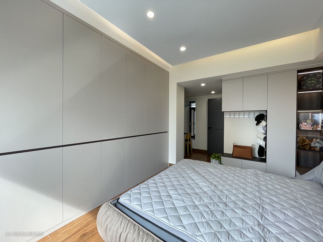 18平大主卧,组合柜一体设计,无主灯+护墙板的高级质感