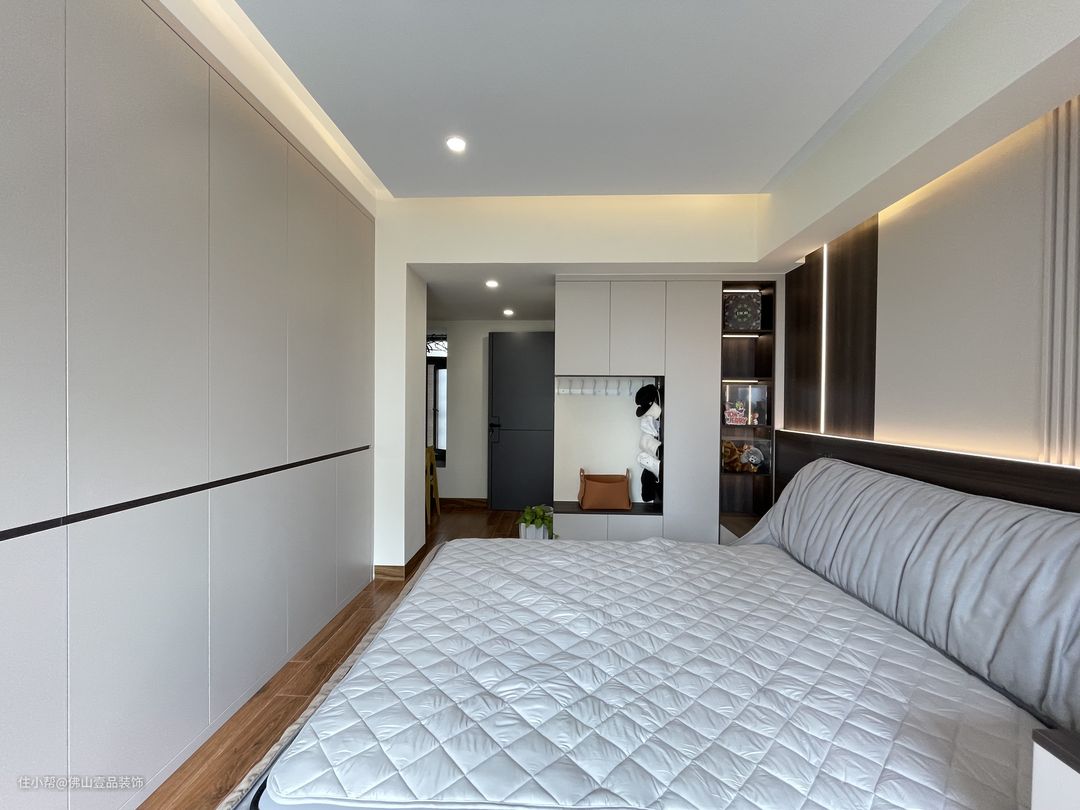 天花灯光:主卧的过道采用的是两盏3500K的筒灯,1.8米宽的大床的床尾同样是两个筒灯,四周是4500K的灯槽,营造了悬浮式的高级质感,又能够很好的兼具卧室各个功能区域的灯光需求,没有卫生死角,方便日常的维护打理。