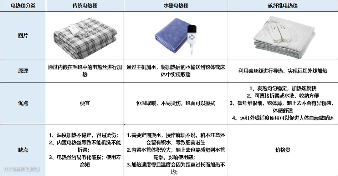 三、电热毯分类(传统、水暖、碳纤维)