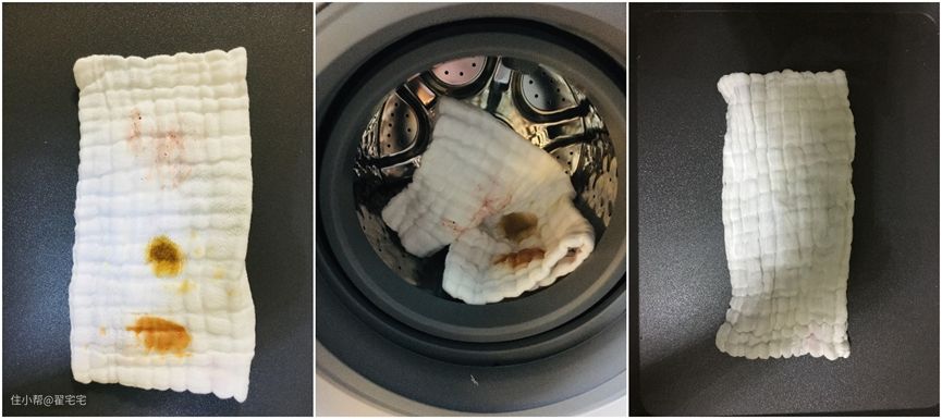 我拿了一块沾有鸡血、酱油、番茄酱等污渍的纯棉毛巾,使用洗烘模式进行清洗。可以看到污渍被洗的干干净净,闻起来也没有一点异味,洗净效果杠杠的。