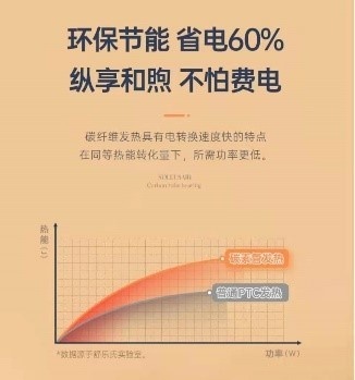 值得注意的是它的碳素管发热体,同样的功率下,碳素管发热量会比普通PTC的发热量要多。也就是说同样的热度,普通取暖器开一小时需要2度电,而舒乐氏这款只需要0.8度甚至更低。