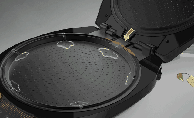 双面加热的电饼铛才有悬浮式设计。悬浮式设计指电饼铛的上盖是可以活动的,可以根据饼的厚度,通过自身重力的调整高度,使上盘和下盘能和饼更好地接触。而且因为是自动的,所以先预热几分钟,等指示灯关闭之后再放入食物。