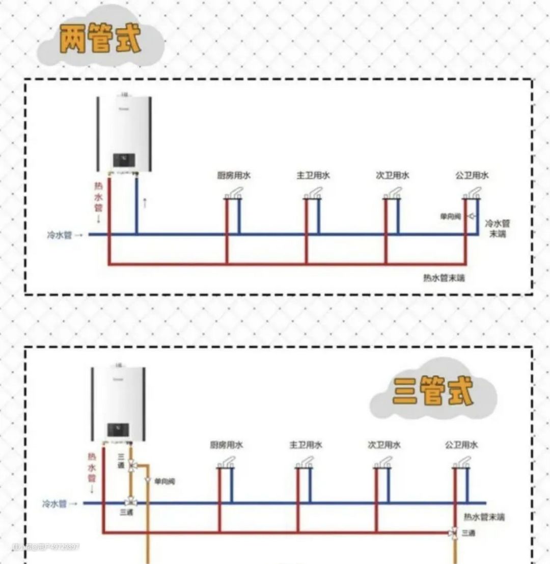 三管式:除了热水管和冷水管之外还有一条回水管,各司其职实现零冷水沐浴,适用于在装修之前提前埋下管道或者后期可以稍微进行改造的家庭。