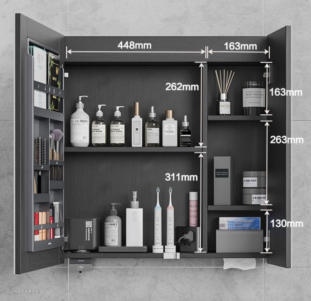 像镜柜,它的镜面部分就有好几个分区,根据大部分的面膜、梳子和护肤品尺寸,做了相应的高度。实现尽量更多的收纳区域,不浪费空间,方便找。