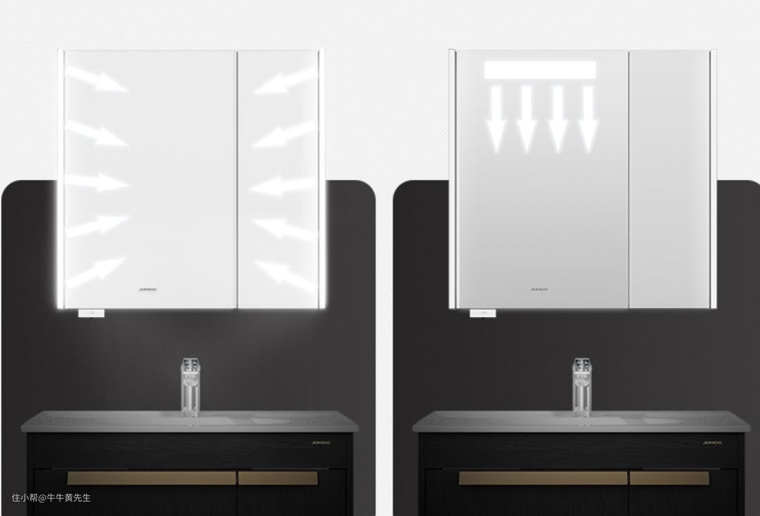 九牧轻奢浴室柜组合用的智能感应聚光灯,要开灯的时候,只要用手一挥,镜柜就会感应你的操作亮起来,不用和开关接触,避免把手弄脏。两边有45度的光线朝中间汇聚,让镜子的照射能力更强,化妆和挤痘痘就很方便。