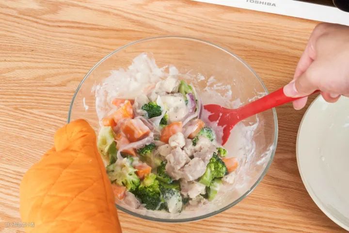 鸡腿肉用盐、黑胡椒腌渍好,放入玻璃器皿里,洋葱切丝、胡萝卜西蓝花切块,盖在鸡胸肉上面。