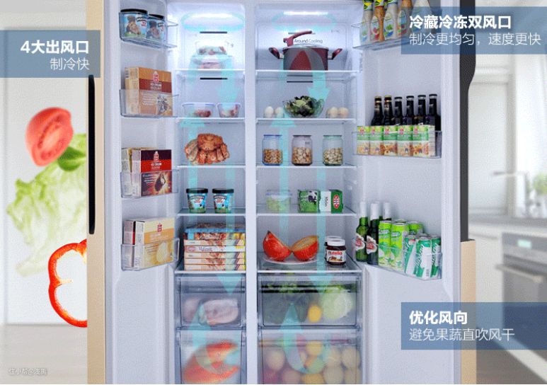 ④ 十字对开门冰箱:这类冰箱虽然只有两个冷冻区和冷藏区,但是还具备干湿分储的区域,可以储存复杂性食物,