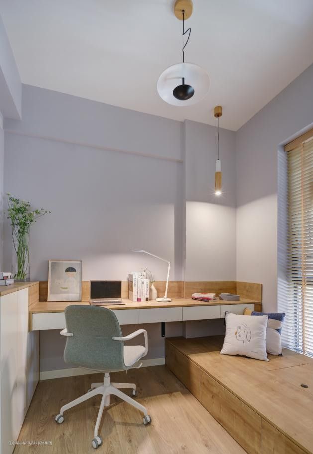 多功能房的墙面同样选择了浅蓝色的乳胶漆,非常的清爽。由于空间较小,所以设计师师选择了半环绕式的空间布局,分别是壁柜、书桌和榻榻米,从高到低一体式的定制设计非常节省空间,实用性也非常高。