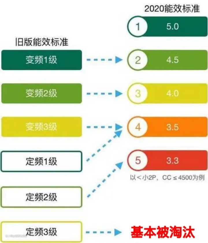 能效等级是衡量空调性能优劣的一个重要参数,通俗来说就是消耗同样电能所产生的冷气量,数字越小节能程度越高。选购的时候需要注意产品用的是哪一版空调新能效标准,旧版能效标准中的变频1、2、3级分别对应新版标准的2、3、4级;旧版定频1、2级分别对应新版标准的4、5级,需要留意的是旧版定频的3级是已经淘汰的。购买时可以直接认定新一级能效,能耗最低。