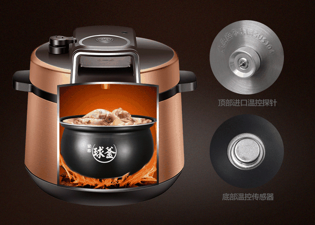 ⑤ 控压技术:利用了压力控制的传感设计来控制锅内的压力,将锅中压力限制在一定的范围内,当超过该范围则自动切断电源,当低于该范围则加速加热。