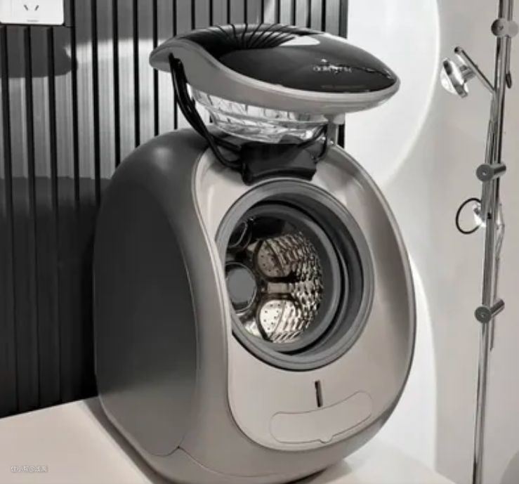 由上图可见,这一款洗衣机是台式的,且体积十分的小巧,是我遇到过体积最小巧同样也是全球能够做到体积如此之小巧的滚筒式洗衣机。放在地面上,占地面积大约是0.11㎡,占地空间可以说是0。另外它还有一个很大的亮点,看清楚图片,滚筒是不是有一些倾斜,这也是它的巧妙之处,采用的20°倾斜滚筒角度,十分的符合人体工程学的设计,在取放衣物上很方便!每一处细节都拿捏的很到位很贴心!
