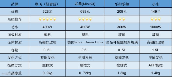 参加实测的产品分别是:摩飞 MR6086轻奢蓝、北鼎(Buydeem)MiniK3【小鹅黄】、乐扣乐扣-粉色、小米(MI)MYSH0E1ACM这4款产品。 4款养生壶产品参数对比: