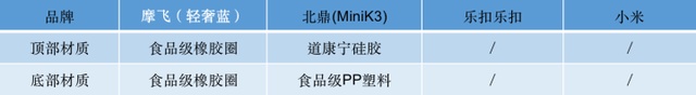 小总结: 摩飞的顶部与底部采用的都是食品级的橡胶圈,安全性能比较高,耐高温为250°;北鼎的顶部采用的是道康宁硅胶,不含双酚A,耐温200°;而乐扣与小米由于产品的造型不同,并没有采用橡胶圈的材质,这里不做比较。 个人很喜欢摩飞和北鼎的盖子,做了双重盖子的设计,小盖子打开可以方便在炖煮过程中加料。