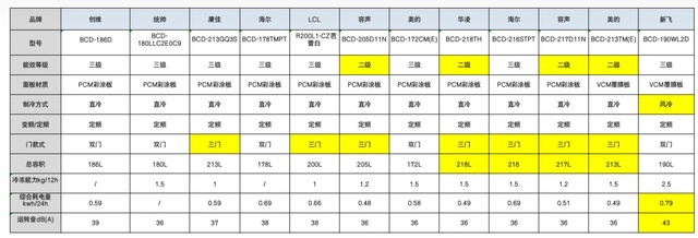 第三个重要参数是综合耗电量,它决定着我们日后使用的开支,所有产品中,耗电量最低的是容声205升三门冰箱,第二名是华凌218升三门冰箱,第三名是美的213升三门冰箱,这三款耗电量都比较低,都是不错的选择。