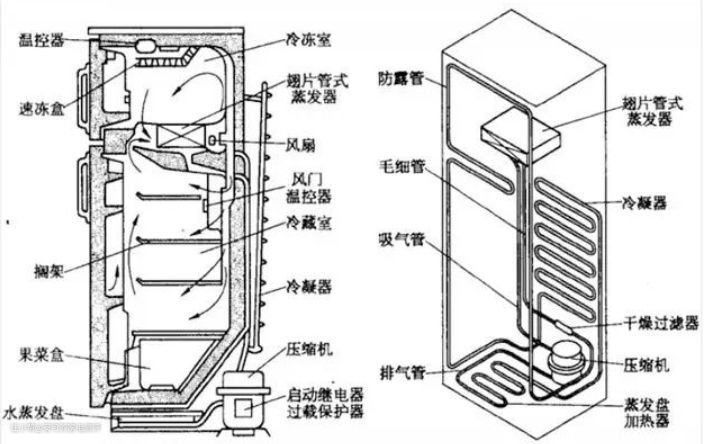 冰箱的制冷系统由由压缩机、冷凝器、蒸发器和毛细管节流器组成,冰箱运作之时,蒸发器将制冷器液化为低压低温气体,再传入压缩机中压缩成高温高压气体,再转入冷凝器中变成高压常温气体,最后又在毛细管节流的作用下变成液体重新进入蒸发器,这个循环的过程即是不断吸热放出冷气,从而实现制冷的目标。