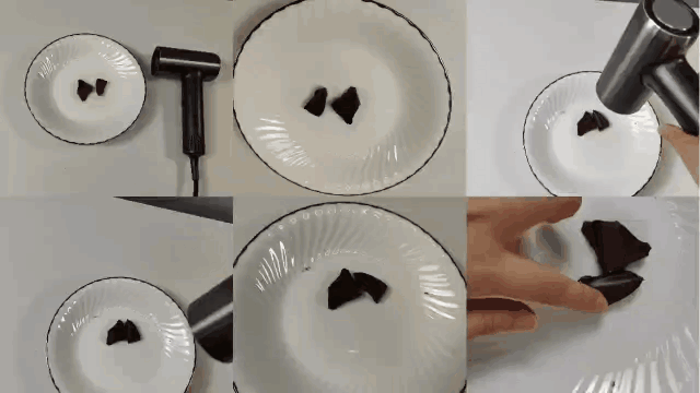 戴森的控温能力好像不太行啊。大家看看我动图里面吹完一分钟,整个巧克力都变成巧克力水了!!!这要是吹到头发上,要哭 松下的也一般般,应该很多人用过松下的吹风机,能明白我的意思,巧克力也融化了很多