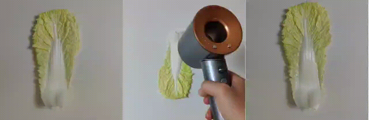 可以看到,这四款吹风机吹干菜叶后,菜叶基本上都保持了鲜嫩,戴森和松下人鱼姬这两款吹风机吹过的菜叶微微有些泛黄,估计是因为温度过高造成的(跟我们做的巧克力试验是相对应的哈)。 护理效果最好的还是AIRFLY 鱼子酱,菜叶还保持了绿色,柔软鲜嫩,这是由于吹风机配备了鱼子酱养护精华风环,能够形成一层护发的保护膜。