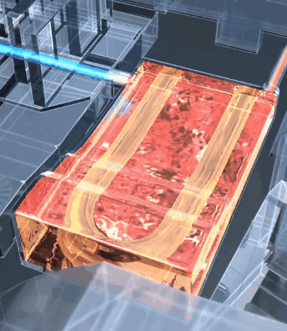 无边圈设计的科勒马桶在图示区域有两个大口径出水孔,冲水瞬间迸发,沿无边圈缸体形成