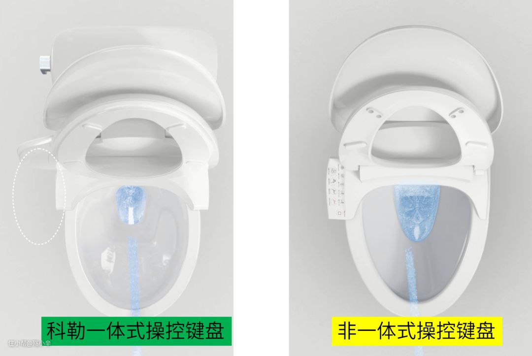 传统智能座便器,侧键盘突起,座圈掀起时操控键盘还在侧边,男性小便容易脏污操控键盘。