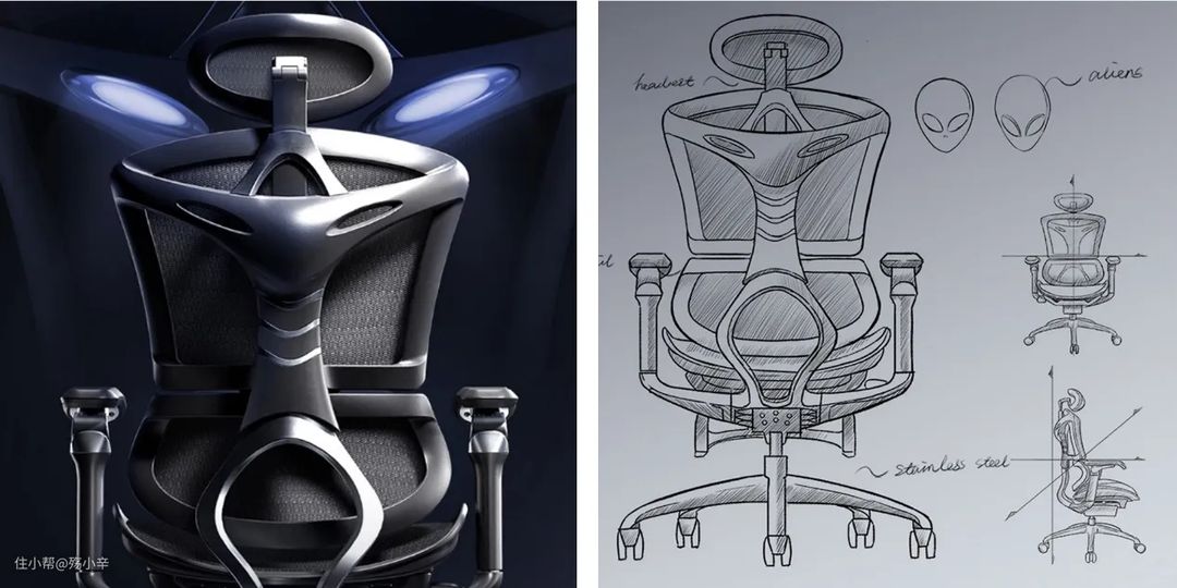 背部采用外星人概念设计(确实非常有识别度),将外星灵感融入座椅设计,对比包裹了皮革的电竞椅看着非常轻盈,对比普通的人体工程学椅又非常有个性!