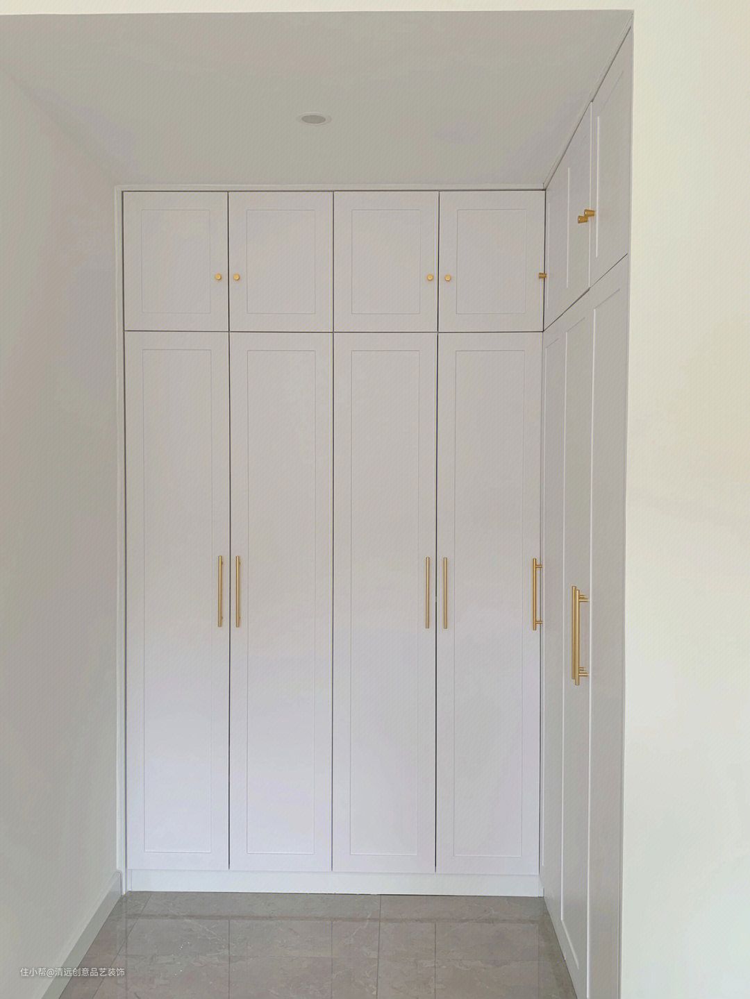 入门左侧是可以收纳一年四季衣物、被褥的衣帽间,米白色柜门,金色拉手,精致又美观。