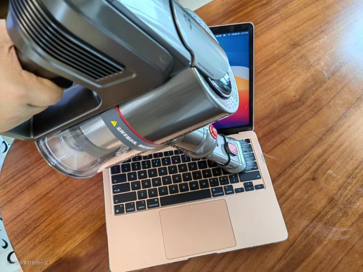 这里我换上了软羽刷,它是专门用于清洁脆弱物品的刷头,可以看到,之前藏在电脑键盘缝隙的一些灰尘和脏东西都被吸了出来(对于我这种喜欢边打字边吃东西都人来说,一个吸尘器可以把我所有内疚解决哈哈)