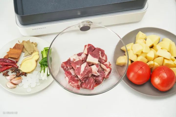 牛腩2斤,土豆4个、番茄2个、葱、姜、八角、香叶、桂皮、冰糖30克、干辣椒