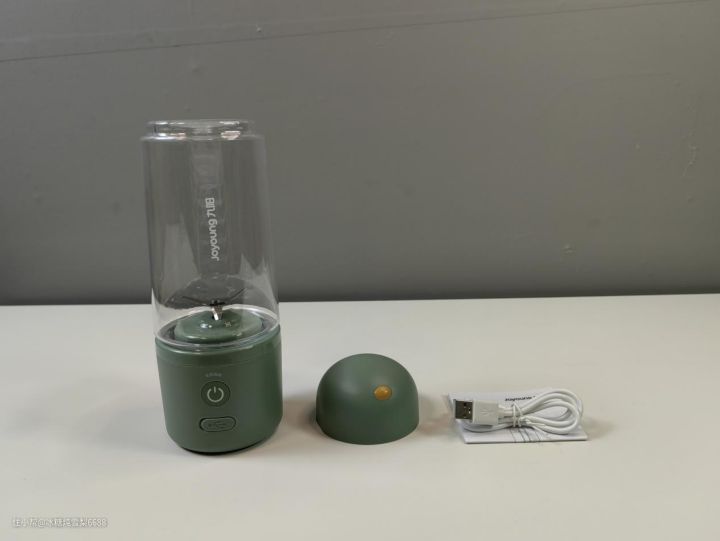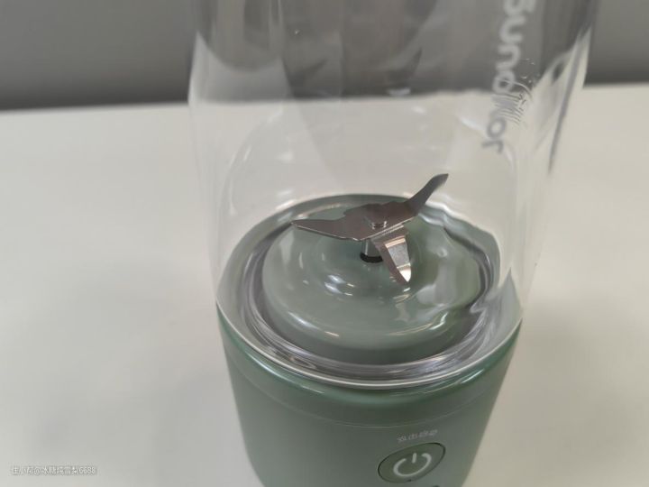 九阳这款榨汁机的主机和杯盖是牛油果绿,外观比较元气,非常小清新,很有夏天的感觉。它的logo在杯身中间,整体设计比较简约。杯身采用tritan食品级材质,成分安全,可放心使用。
