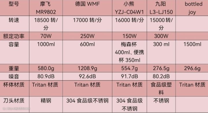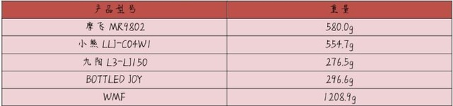 重量(由重到轻):WNF>摩飞>小熊>BOTTLED JOY>九阳