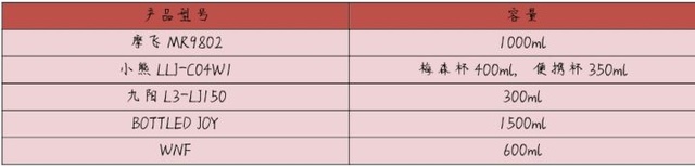 容量(从大到小):BOTTLED JOY>摩飞>WNF>小熊>九阳
