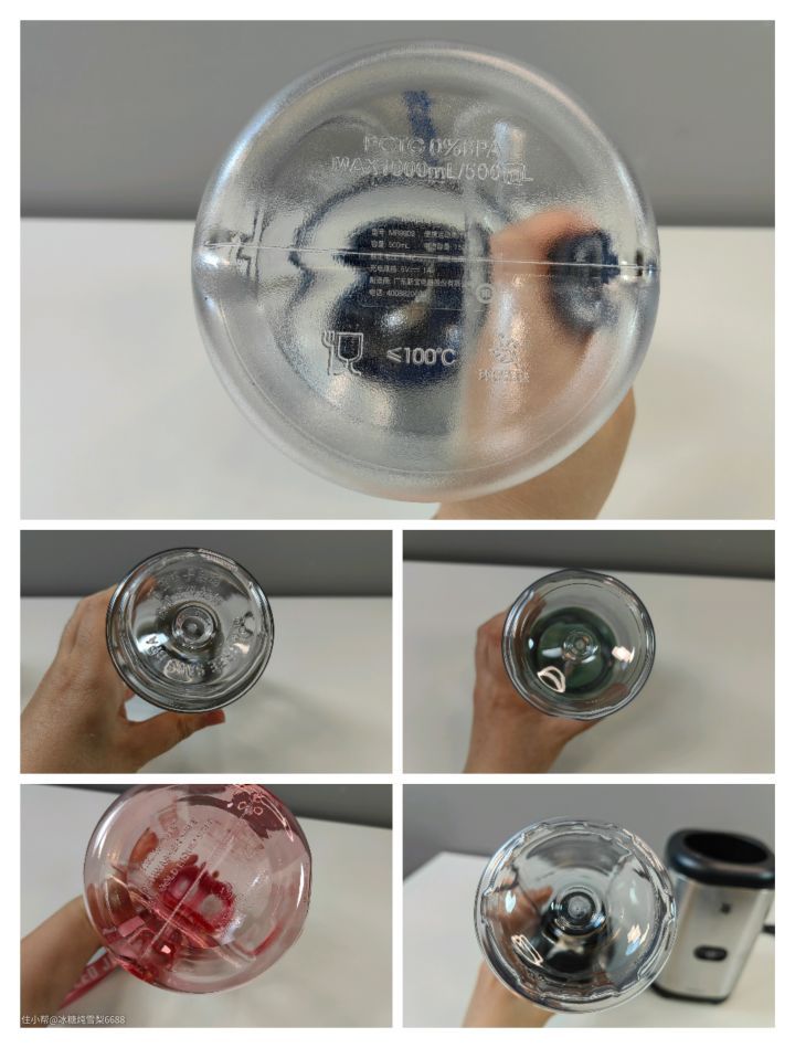 这5款水杯中摩飞、小熊、九阳、WMF都是采用Tritan食品级安全材质,不含有毒物质,材质清澈透明,有良好的抗水解性能,且耐高温、耐摩擦、且不易碎裂。BOTTLED JOY采用PETG材质,成分也比较安全,耐热性能稍微比Tritan差一点点。