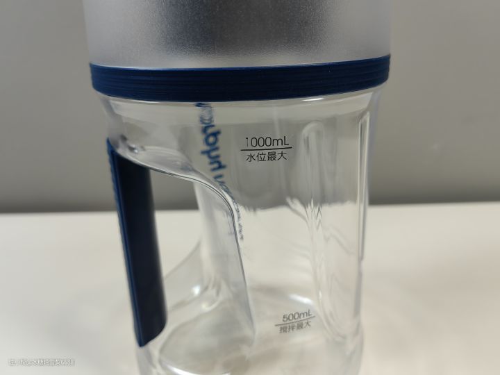 2、整个榨汁桶走简约设计,桶身有两处水位线,分别为1000ml的最大水位线和500ml的最大搅拌水位线,榨汁和饮水两用,其容量跟bottled joy基本可以媲美,换上直饮杯盖后也非常轻便,摇身就能变成网红吨吨桶。