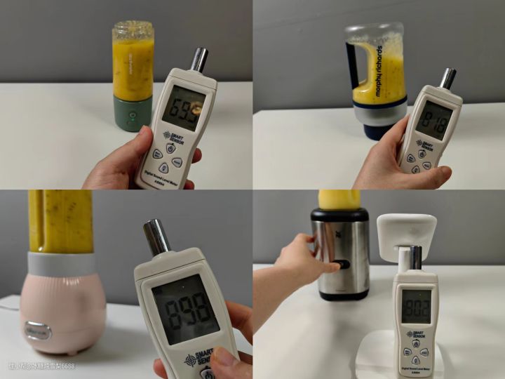 其实家电产品的噪音多多少少还是有的,尤其是榨汁机这种高速运转的电器,噪音自然是不可避免的,我们再来看看4款榨汁机运行是的噪音分别有多大(这里的数值要比真实数值大,因为放在我的小桌子上震动声音比较响哈)