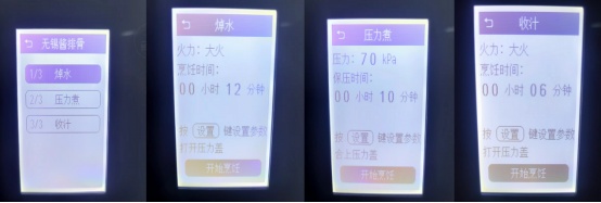 别担心,苏泊尔已经贴心的帮你想到这一点了,在点击每个菜式后都会显示制作流程,用户只需按照流程一步一步操作即可完成菜式,并且每个流程上的火力、压力和时间都是可调的。比如这个无锡酱排骨,我想要排骨软烂一点,就把压力调高一点;我想要酱汁浓稠一点,就把烹饪时间调节久一点,可是实现像人工做菜一样有不同的口感。