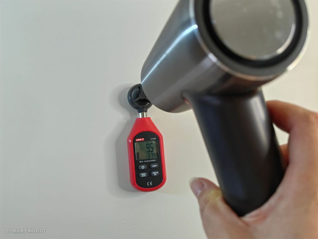 接下来是高档位的情况,我拿在手里,都能感觉到风速明显提升了,风速计显示的数据更是达到了9.5米/秒,高速吹风机真是名不虚传。