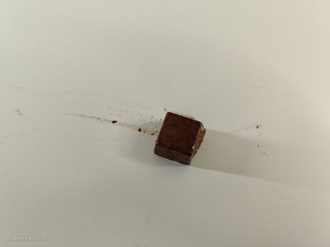可以看到,打开吹风机吹了不到两分钟,本来还硬邦邦的巧克力块,表面就已经开始融化了,并且几个迎风面融化的都很均匀