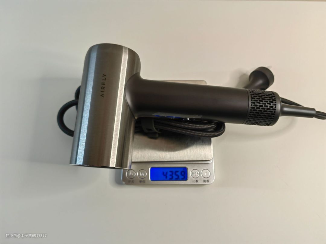 因为吹头发其实还是需要一定的时间的,之前我用的普通吹风机就是因为太重了,长时间吹头发手举着很酸,才被我慢慢淘汰的,不过这款AIRFLY鱼子酱吹风机拿在手里,还是很轻的,放在电子秤上秤一下重量,为436克,长时间吹头发也不会手酸。