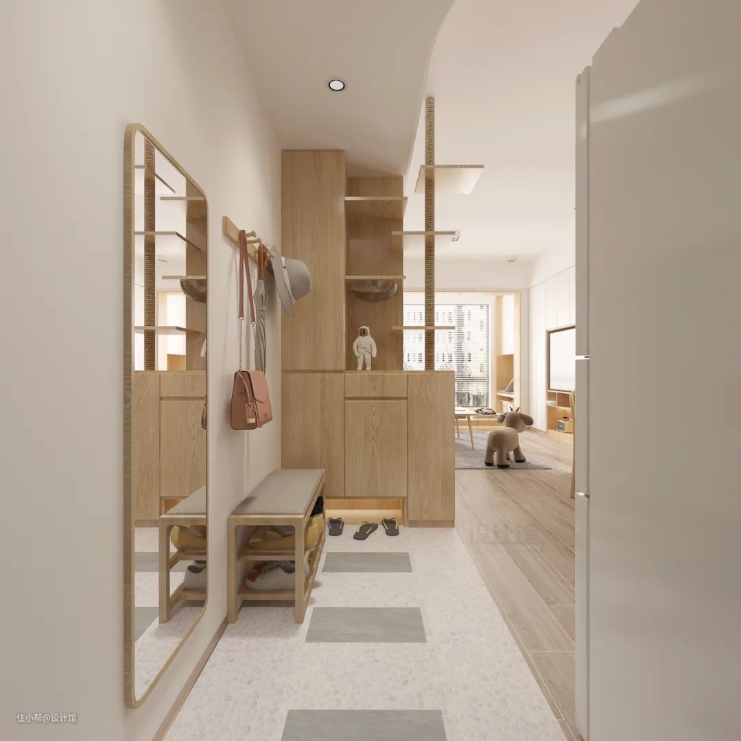 不够宽的玄关,通过户型改造也能摆下一整面墙的大鞋柜,并且保留足够宽松的玄关过道。