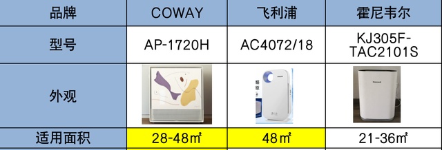 【对比结果】 本次测评的3款空气净化器中,COWAY和飞利浦的适用面积最大,达到了48㎡,对于一般的家庭来讲已经足够实用了。而布鲁雅尔和霍尼韦尔的适用面积也在30-40㎡之间,对于卧室、客厅这些使用场景来说也是绰绰有余的。
