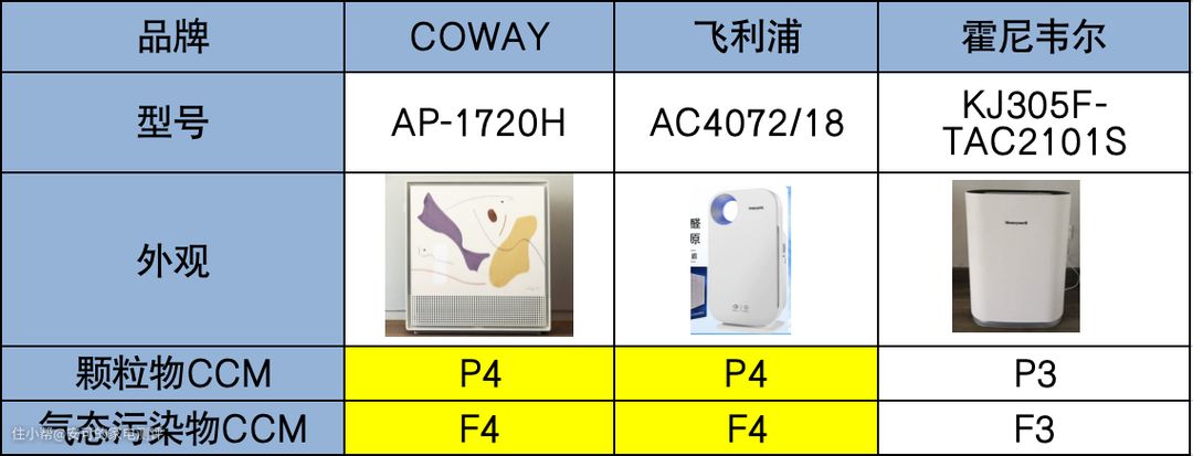 【对比结果】 COWAY>飞利浦>霍尼韦尔 这次,我必须要点名的是霍尼韦尔,在这等级是最低的的,也就是说它的滤网更换时间要短一些。 而COWAY、飞利浦的CCM值都达到了P4和F4的级别,净化能力都比较强,滤网的使用寿命也都达到了最长使用的指标。