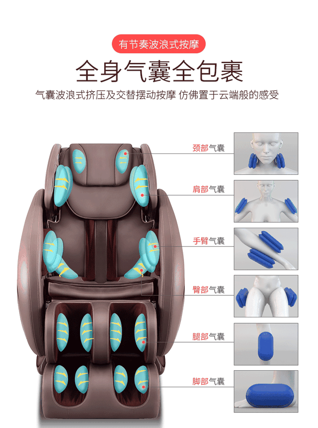 气囊通过气压来实现对全身肌肉的揉捏放松,绝大多数的揉捏功能都是通过气囊来实现的。在选择具体品牌型号的时候,对气囊的考察也至关重要。首先要观察气囊的分布范围,尽可能广是最好的,如果预算内无法选择气囊分布很广的型号,可以侧重选择自己切实需要的范围。
