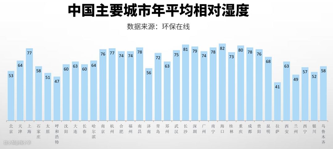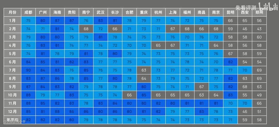南方城市则更明显,在 先看评测 制作的这个南方省会城市2019年每月的平均空气湿度表中,基本上南方每个月份的湿度都超过了70%