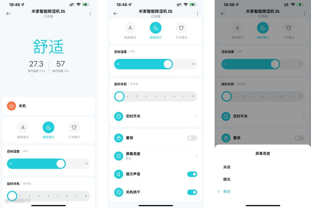 APP交互简单,支持童锁、屏幕亮度调节、定时开关。